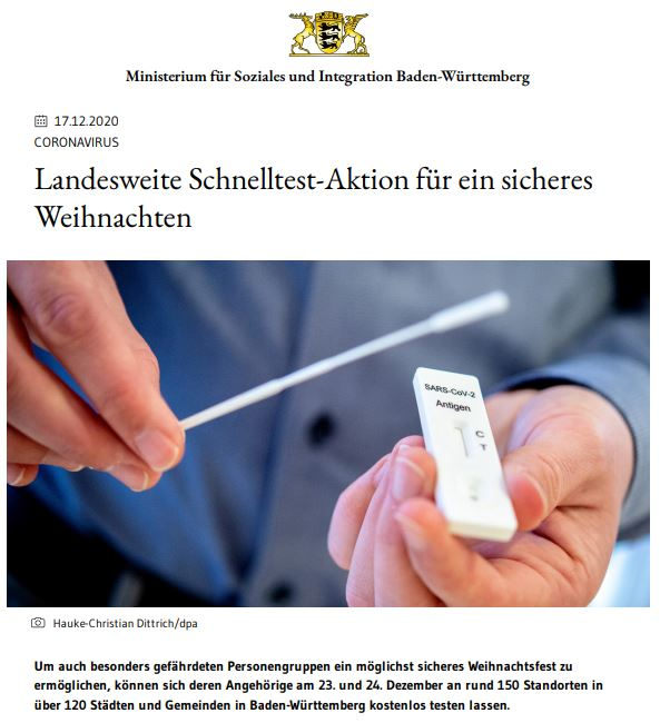 Landesweite Corona Schnelltestaktion für ein sicheres Weihnachten